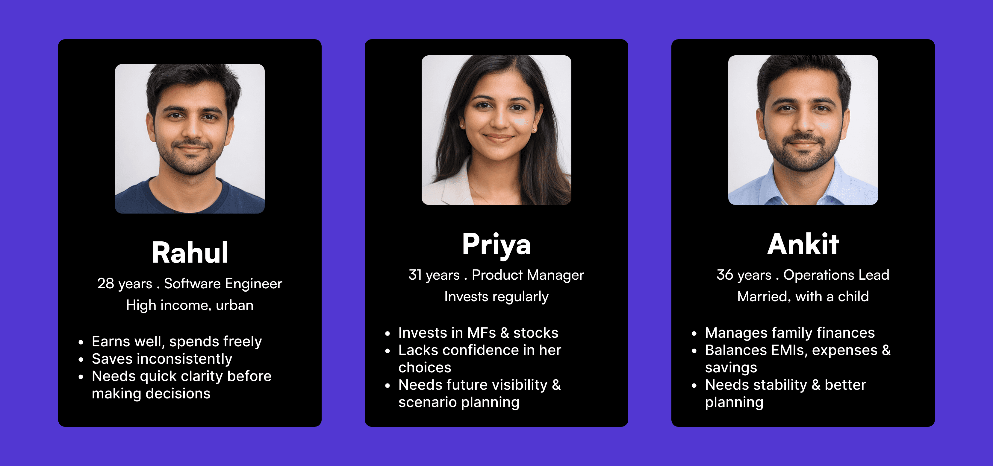 I spoke with 11 people across different life stages and financial situations: early-career, mid-career, recently made redundant, freelance, dual-income. I deliberately included people who described themselves as 'financially anxious' and people who described themselves as 'financially confident' — because I wanted to understand what the gap between those two states actually looked like, not assume I already knew. The conversations weren't about budgeting tools. They were about trust, control, and the specific feeling that precedes a financial decision. Three patterns appeared consistently enough that I treated them as design constraints rather than just insights. The Avoider Mid-20s, irregular income. Opens the app, feels overwhelmed by the number of things to attend to, closes it. Says: 'Looking at it somehow makes it feel worse than not knowing.' The app's comprehensiveness is the problem — it surfaces too much and guides too little. The Tracker Late 20s, stable salary, logs every transaction meticulously. Has a complete picture of their finances. Still doesn't act on it. Tracking has become a substitute for deciding — the ritual of logging feels like doing something, even when nothing changes. The Reactive Early 30s, two income streams. Makes financial decisions impulsively when prompted by a specific event — a bill, a purchase, an unexpected expense — then regrets them and repeats the cycle. Knows they need a system. Hasn't found one they trust. Every person I spoke with had a version of the same sentence: 'I know I should do something. I just don't know what.' Tracking apps had been answering a question nobody was asking. The real question was always: given my situation right now, what's the right move?