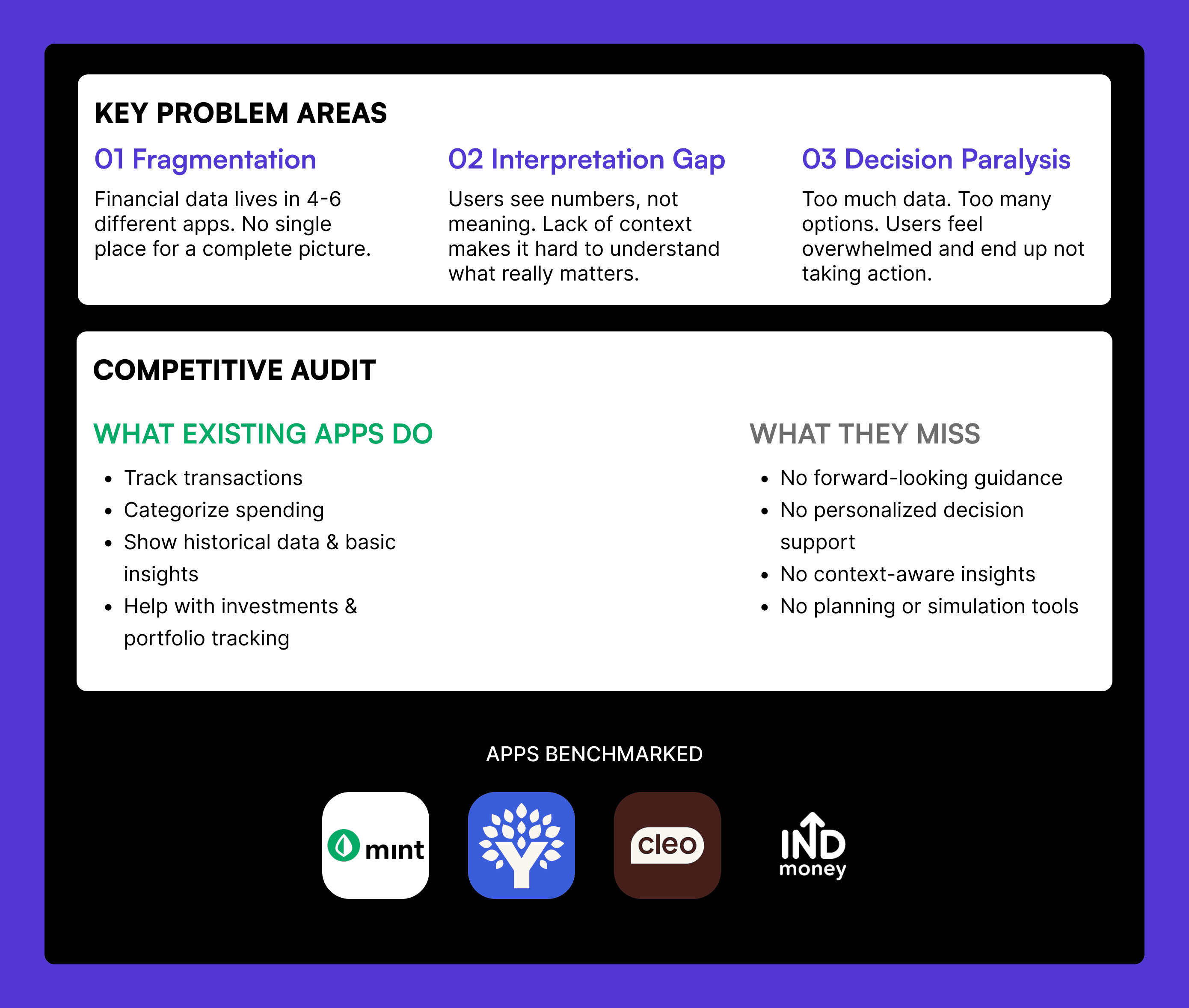 The insight that restructured everything wasn't in the data — it was in a pattern across the data. Every person who described themselves as 'financially anxious' had accurate information about their situation. They knew their numbers. What they lacked was confidence in what the numbers meant and certainty about what to do next. The reframe: from retrospective reporting to forward-looking guidance. From 'here's what happened' to 'here's what to do.' That shift — from dashboard to advisor — became the core design principle. Everything else followed from it.