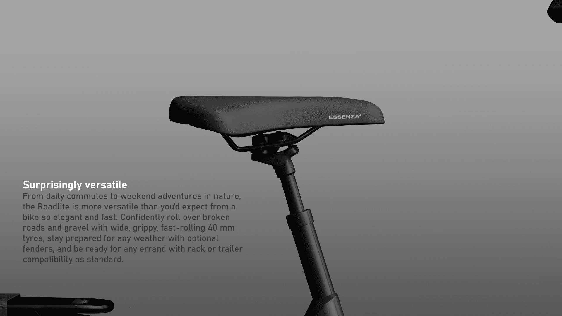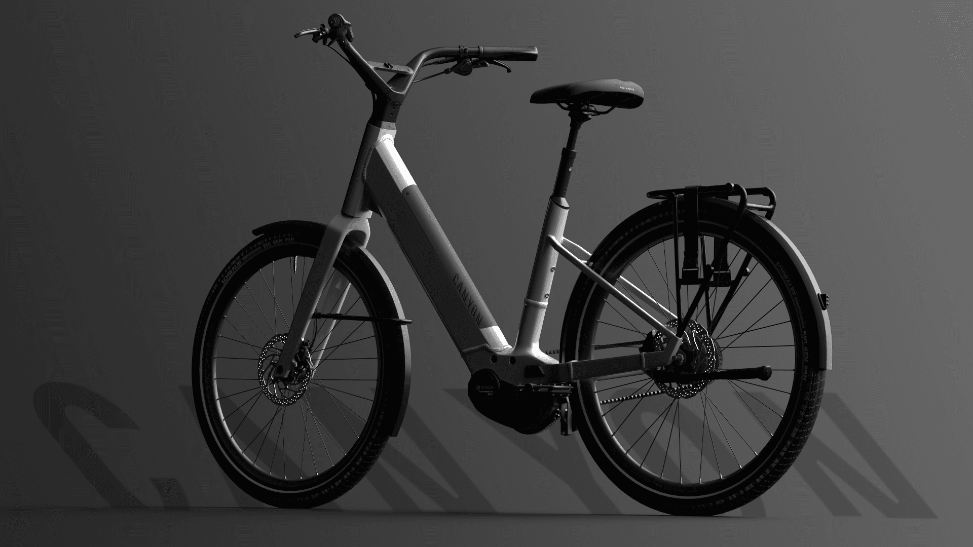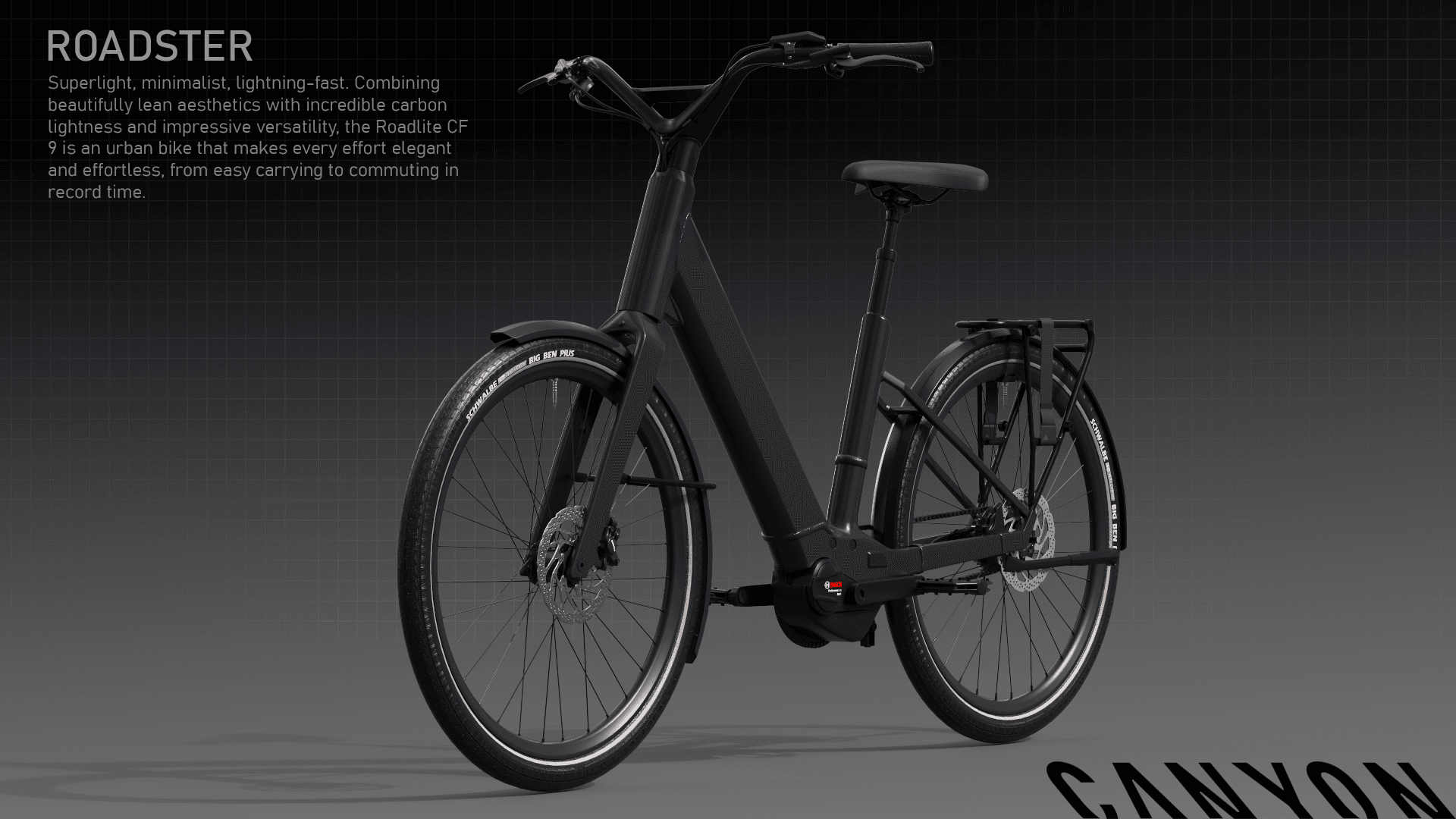 A series of close-up 3D renders of the Canyon Roadster bike set against a smooth grey or gradient background. The visuals highlight precision-engineered components—frame geometry, carbon fiber textures, drivetrain details, and aerodynamic design lines. Minimal text overlays complement the artwork, featuring key bike specs and performance notes, creating a modern, premium product-design presentation.