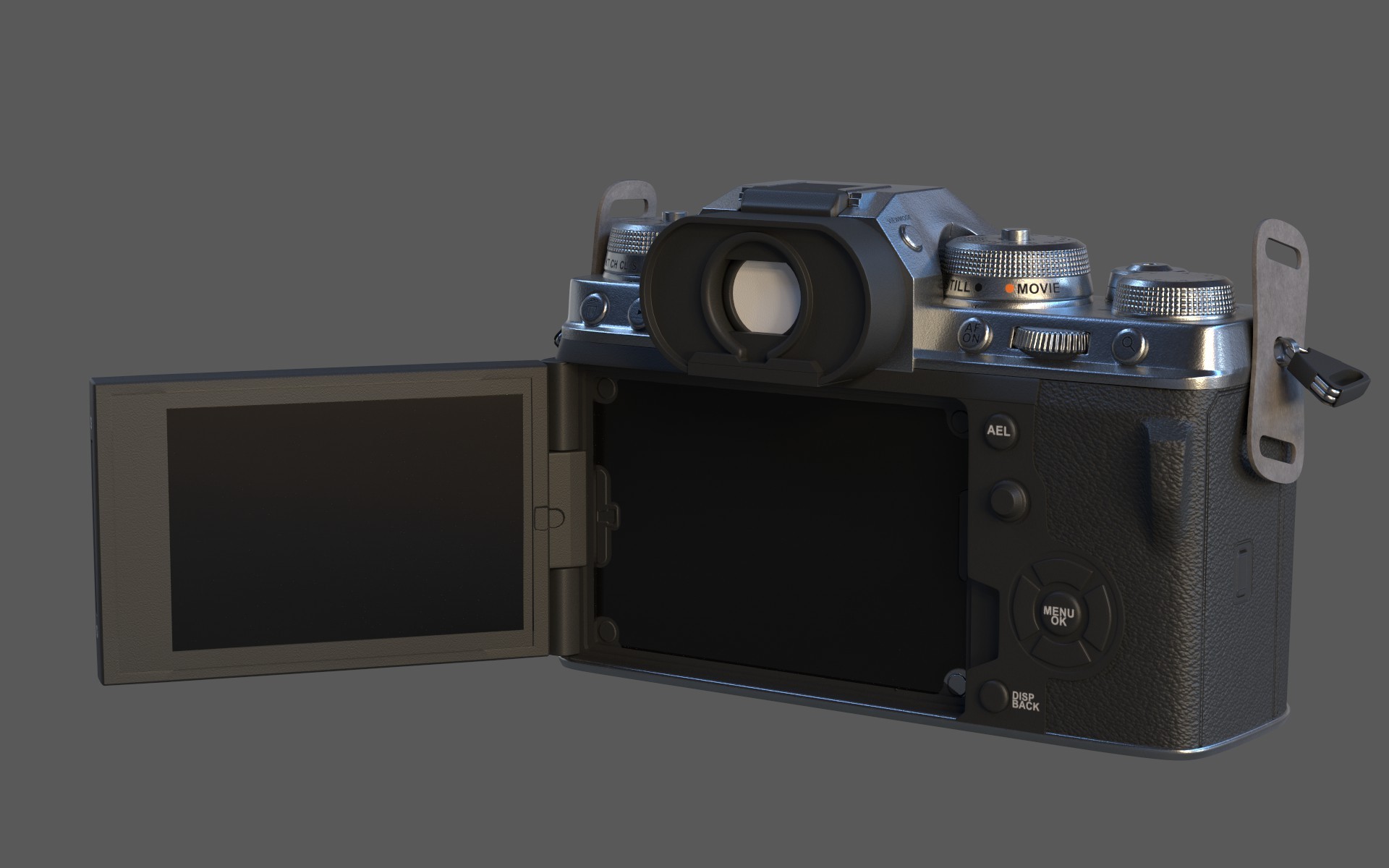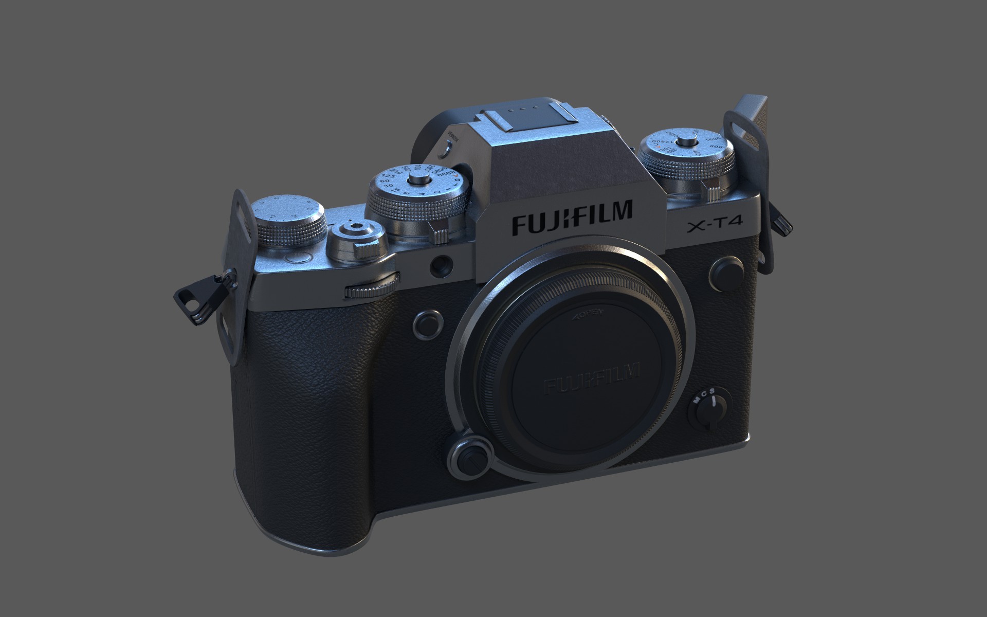 A crisp 3D render of the Fujifilm X-T4 set against a deep black background. Close-up angles highlight the camera’s textured body, metal dials, and precision-engineered lens elements. Clean reflections and subtle rim-lighting accentuate its professional build, creating a bold, premium product-design presentation.