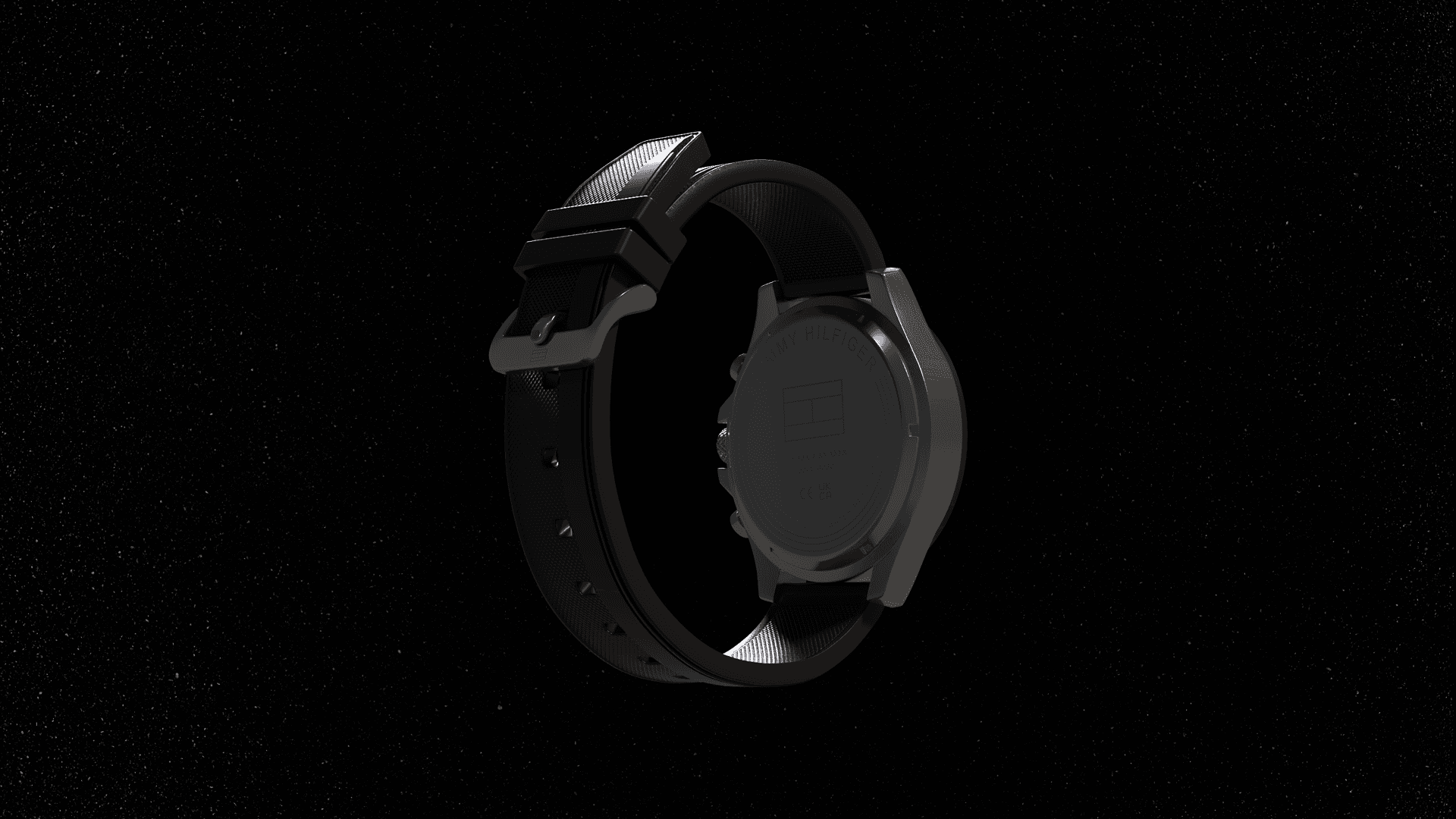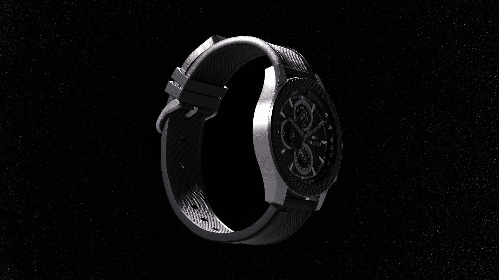 A sleek 3D render of a Tommy Hilfiger watch floating in a black space background. Sharp highlights and clean reflections emphasize the polished metal, glass clarity, and signature brand details, giving the timepiece a modern, premium, product-design aesthetic.